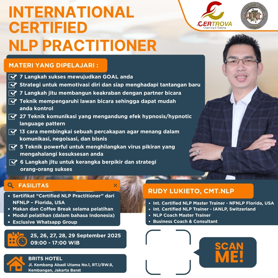 – Sertifikat “Certified NLP Practitioner” dari NFNLP – Florida, USA
